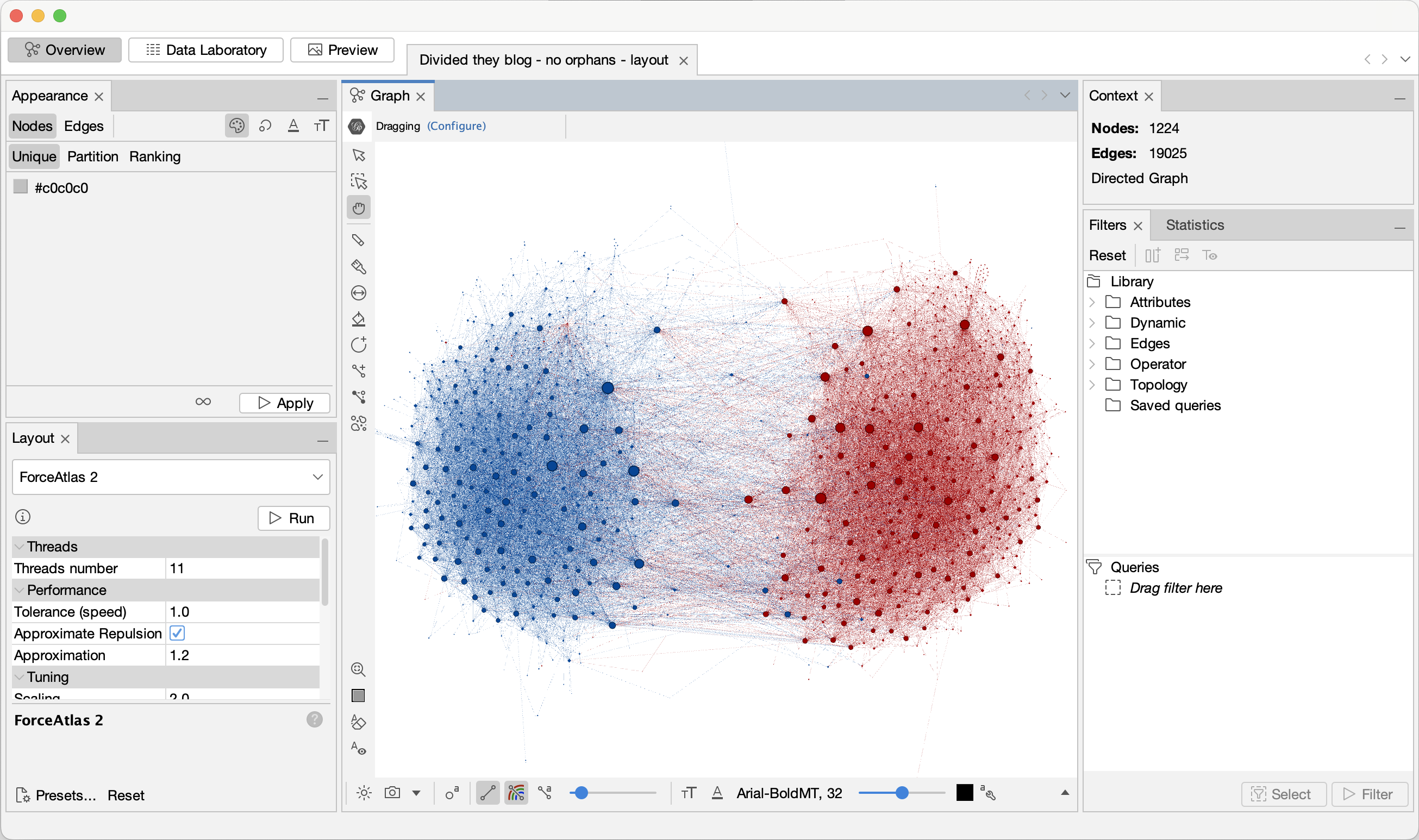 Layout algorithms define the visual structure of your graph. Gephi offers state-of-the-art network layout algorithms that balance both efficiency and quality.