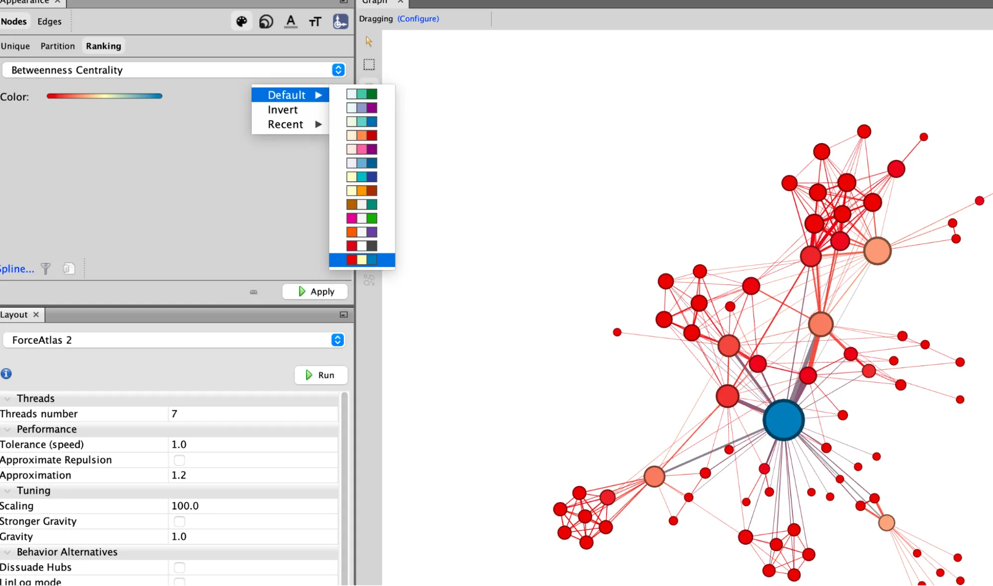 You can now return to the ‘Appearance’ window to change the colour of the nodes based on the Betweenness centrality you just calculated.