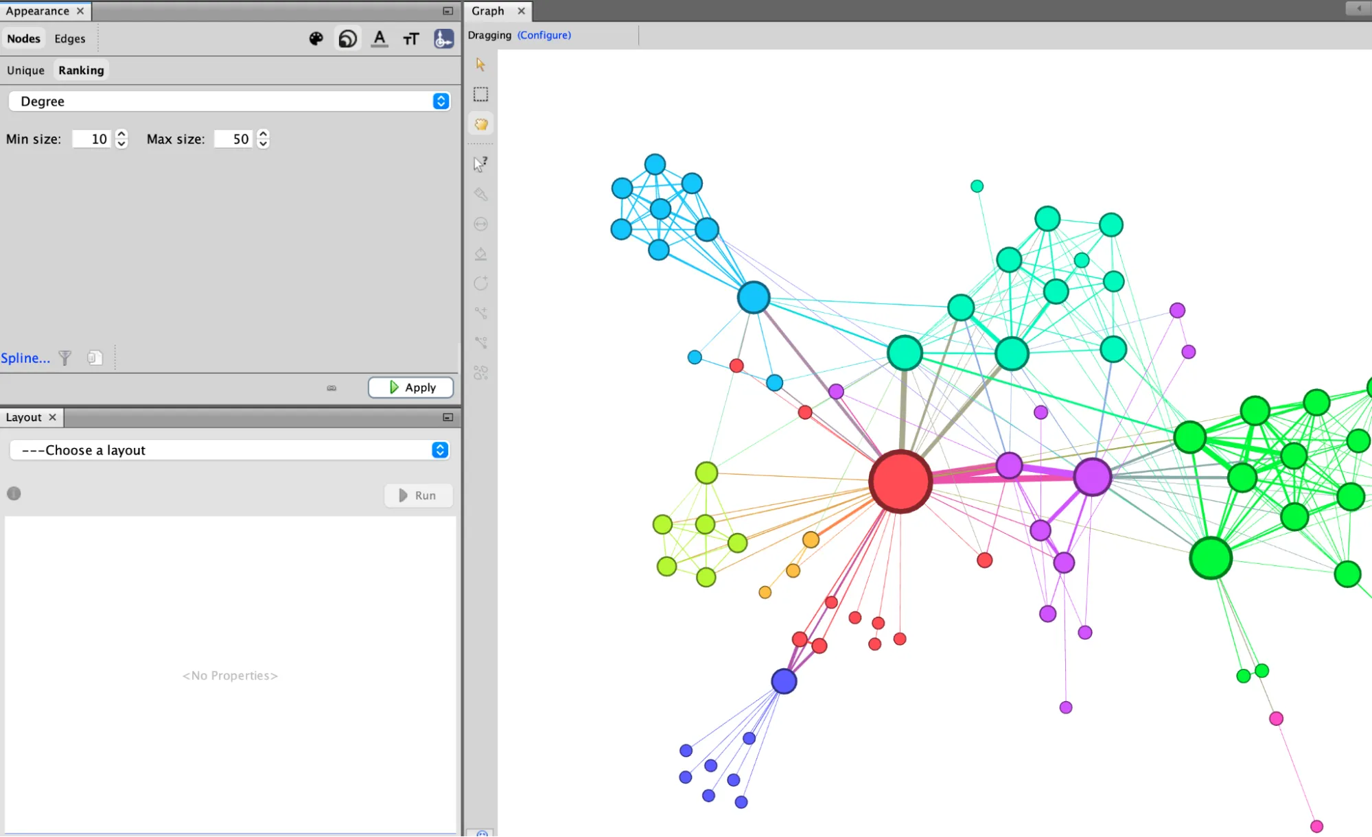 - Double-click on “Topology” and then “Degree Rank” to filter nodes based on the number of their connections