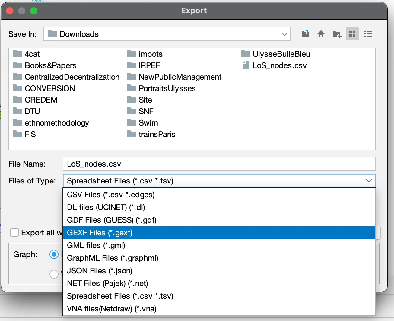 In the top menu, click on “File” and then ”Export” and “Graph file…” to save your network in .gexf, .graphml or other formats.