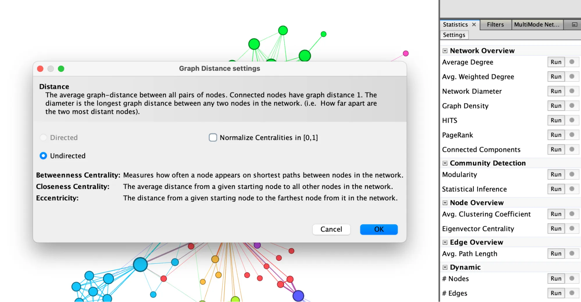 On the right side of the screen, the ‘Statistics’ window allows you to calculate certain properties of the graph. For example, it includes centrality metrics and calculations that provide information about the overall structure of the network, its clusters, and communities.