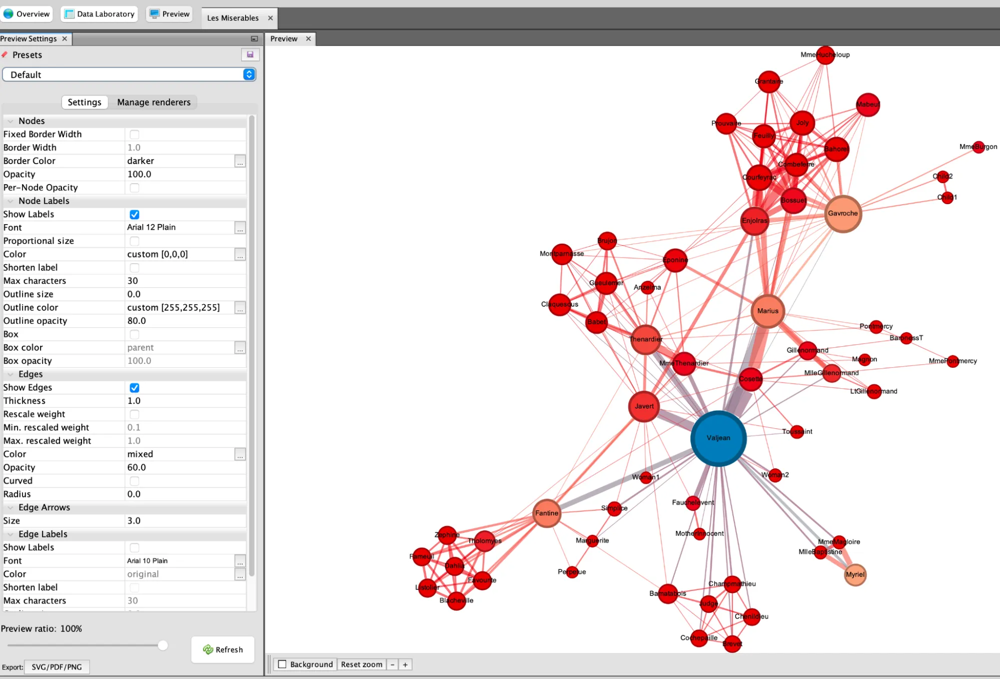 - For example, select ‘Show Labels’ to display the names of the characters in Les Misérables, but deselect ‘Proportional size’ so that they are all the same size.