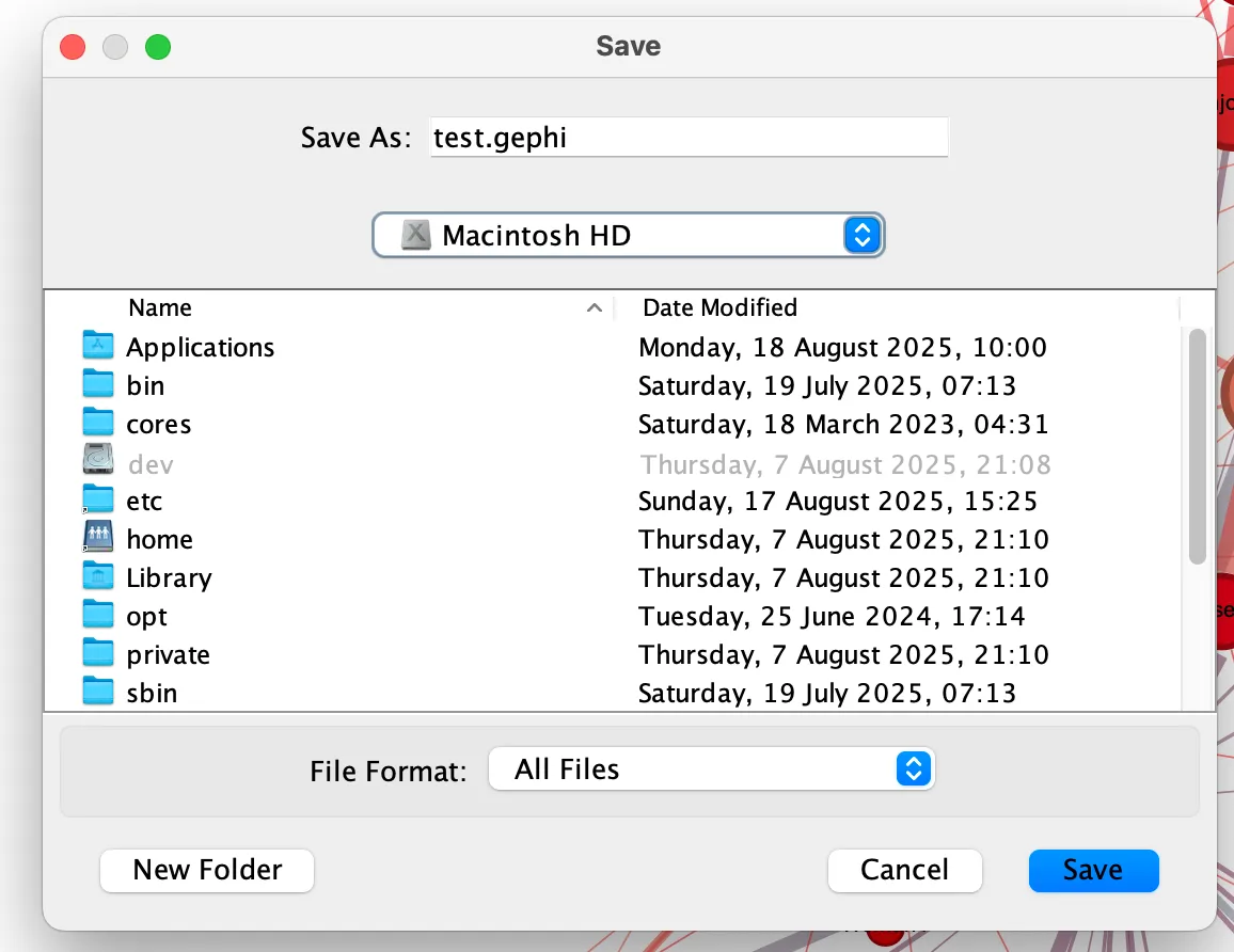 In the top menu, click on “File” and then ”‘Save” to save your document in .gephi format.